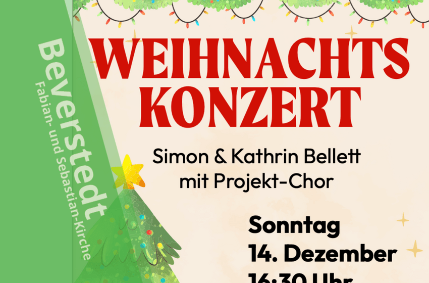 Am 14. Dezember findet in der Beverstedter Kirche ein Weihnachtskonzert mit Simon und Kathrin Bellett und ihrem Projekt-Chor statt. Der Eintritt ist frei, Spenden sind aber willkommen. Beginn ...