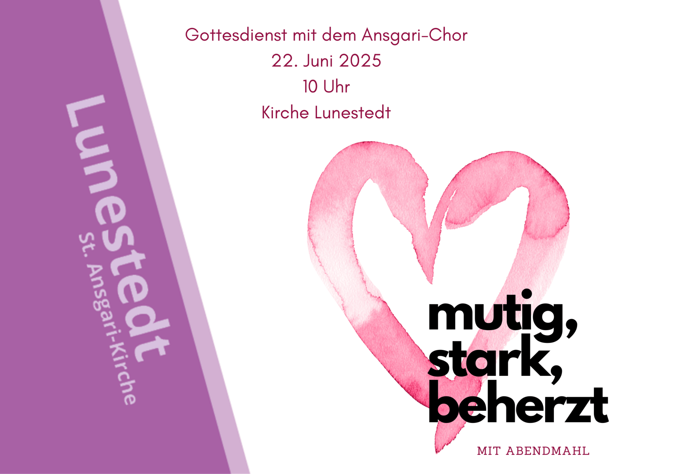 Am 22. Juni laden wir zu einem ganz besonderen Gottesdienst in Lunestedt ein: der Ansgari-Chor gestaltet einen musikalischen Gottesdienst zum Thema "Mutig, stark, beherzt", zusammen mit Jörg Renger und Michael Behrens.