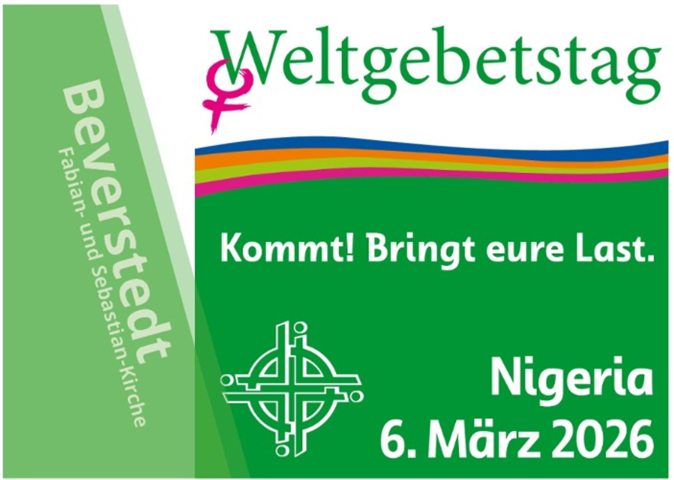 Am Freitag, den 6. März 2026, feiern Menschen in über 150 Ländern der Erde den Weltgebetstag der Frauen aus Nigeria. „Kommt! Bringt eure Last.“ lautet das hoffnungsverheißende Motto in diesem Jahr, angelehnt an Matthäus 11,28-30. Wir hier in der Dreieinigkeitskirchengemeinde bereiten diesen Gottesdienst mit einigen Interessierten vor und feiern ihn mit euch am 06. März um 19 Uhr im Gemeindehaus in Beverstedt. Wir hören etwas über das Land Nigeria, über die Sorgen und Nöten und lernen das Land von der kulinarischen Seite kennen. Wir probieren Rezepte aus und essen nigerianisch im Anschluss an den Gottesdienst. Eine Anmeldung ist nicht erforderlich.