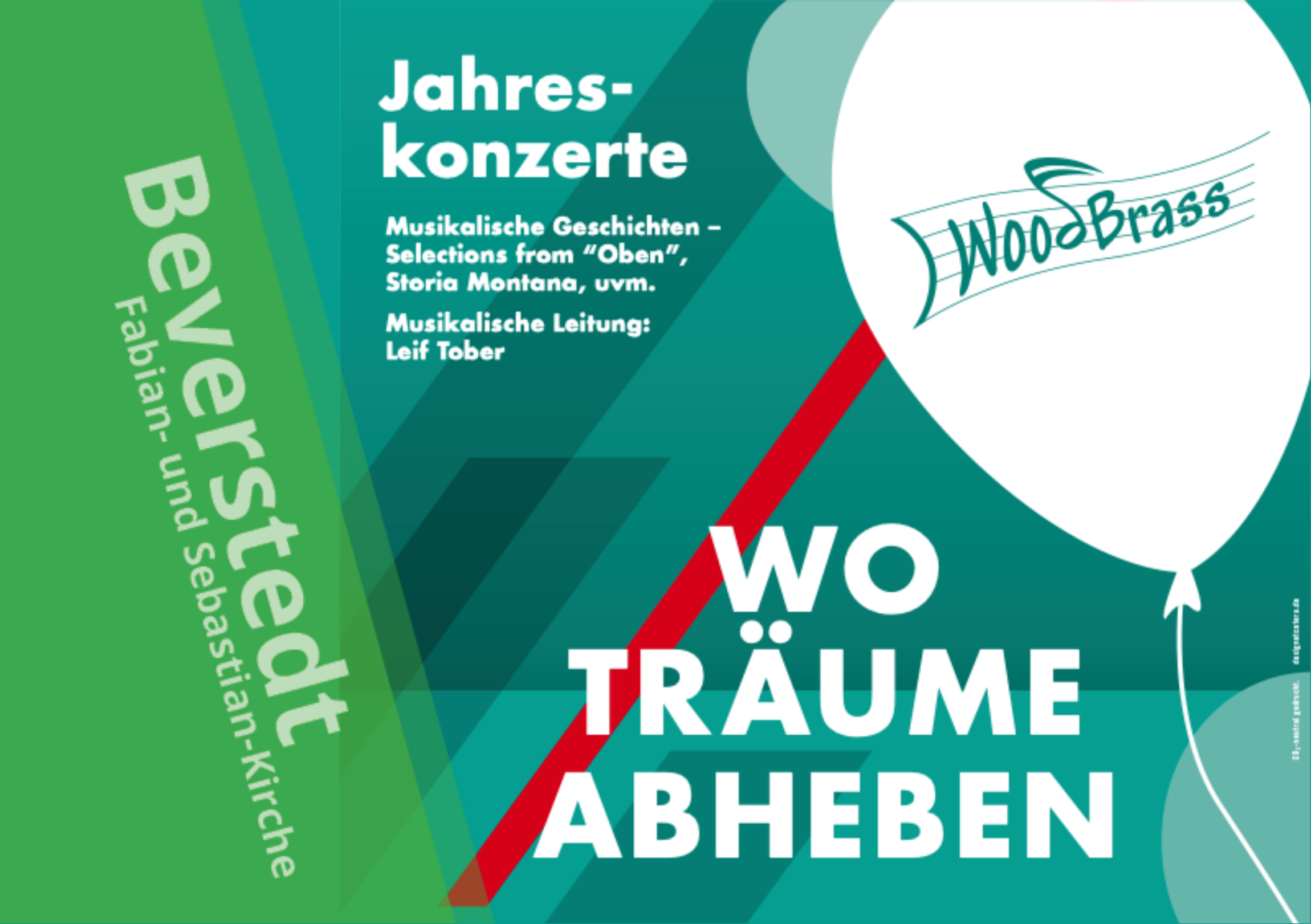 WoodBrass, das Nachwuchsorchester des Sinfonischen Blasorchesters Wehdel, lädt Sie herzlich zu seinem diesjährigen Jahreskonzert am 19.04.2026 in der Fabian- und Sebastian- Kirche in Beverstedt ein. In diesem Jahr steht das Programm unter dem Motto "WO TRÄUME ABHEBEN", bei dem jedes Stück seine eigene Geschichte erzählt, die durch die verschiedenen Klangfarben eines Blasorchesters vertont werden. Dabei formen sowohl ruhige und warme als auch strahlende und festliche Melodien ein Konzert, das beflügelt. Das Programm ist eine bunte Mischung aus sinfonischer Blasmusik und modernen Bearbeitungen der Pop- und Filmmusik. So nimmt Sie unter anderem das Stück „Storia Montana“ von Thomas Doss auf eine Reise durch ein Gebirge mit, oder Michael Brown gibt Ihnen mit dem Medley „Selections from Oben“ einen Einblick in die Filmmusik des bekannten Animationsfilms.