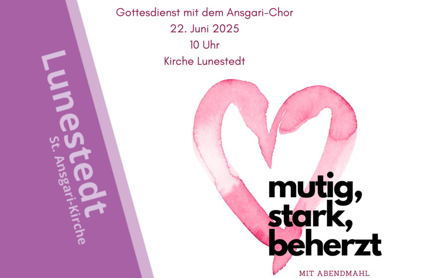 Am 22. Juni laden wir zu einem ganz besonderen Gottesdienst in Lunestedt ein: der Ansgari-Chor gestaltet einen musikalischen Gottesdienst zum Thema "Mutig, stark, beherzt", zusammen mit Jörg ...